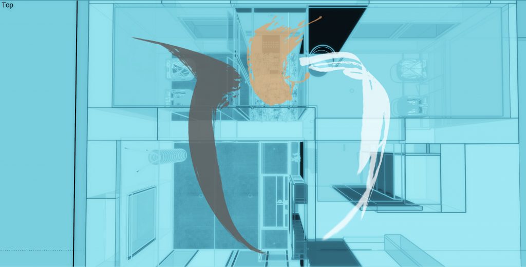 tra questi due mondi, un volume centrale arancione si inserisce come una cerniera spaziale e simbolica: separa e unisce, protegge e rivela.