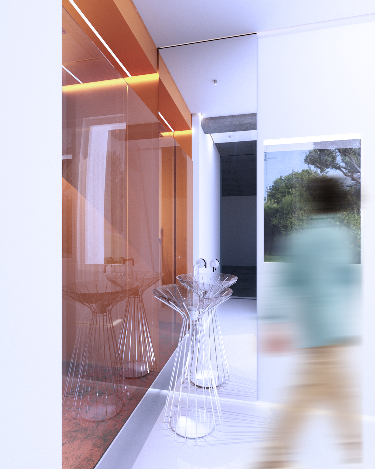 between these two worlds, a central orange volume inserts itself as a spatial and symbolic hinge: it separates and unites, protects and reveals.