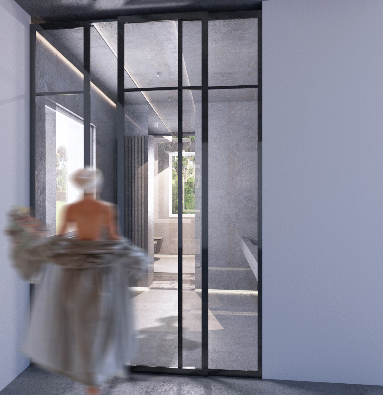 the second, reserved for the villa’s owners, total grey: deep, material, intimate, fully glazed towards the bedroom, in a direct and continuous relationship between body, space, and intimacy.