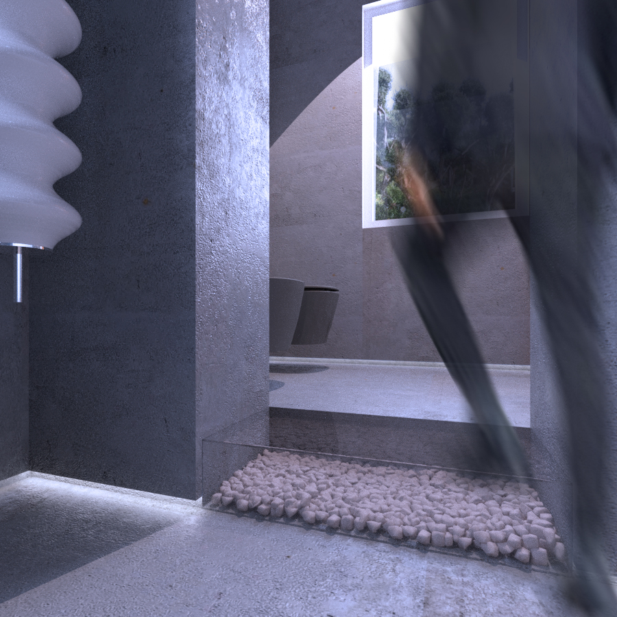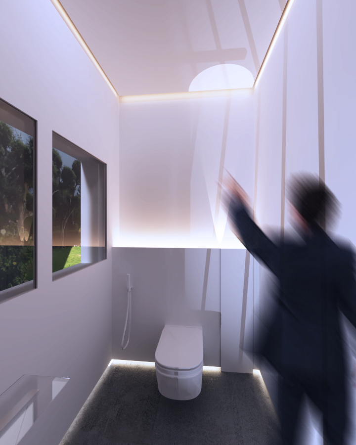 il secondo, riservato ai proprietari della villa, total grey: profondo, materico, raccolto, totalmente vetrato verso la camera da letto, in un rapporto diretto e continuo tra corpo, spazio e intimità.