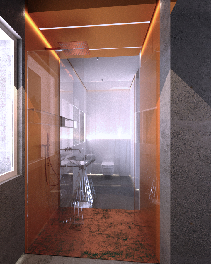 inside it, the glass shower box appears as a transparent void, a place of passage where light, color, and matter enter into continuous dialogue.